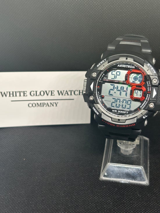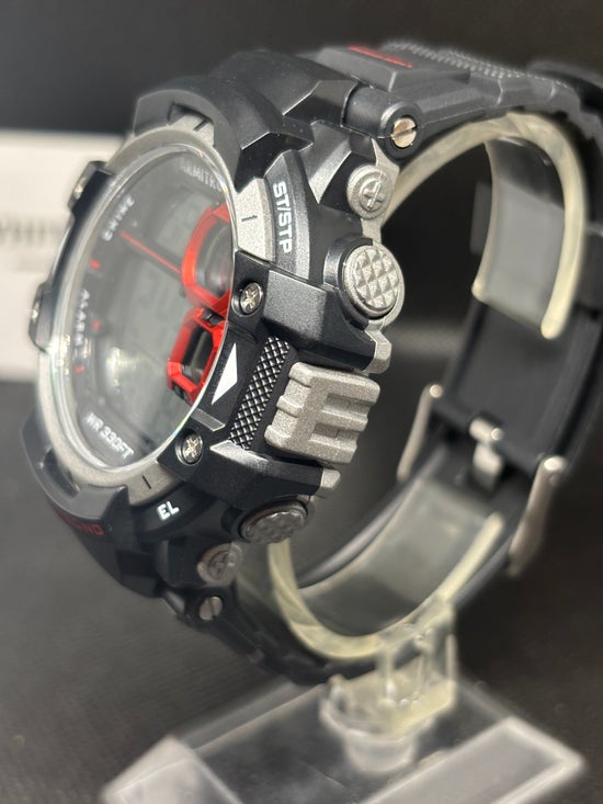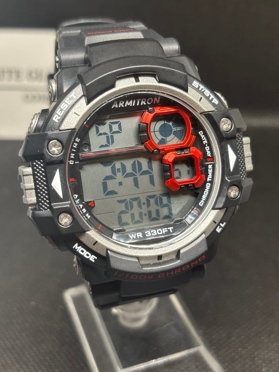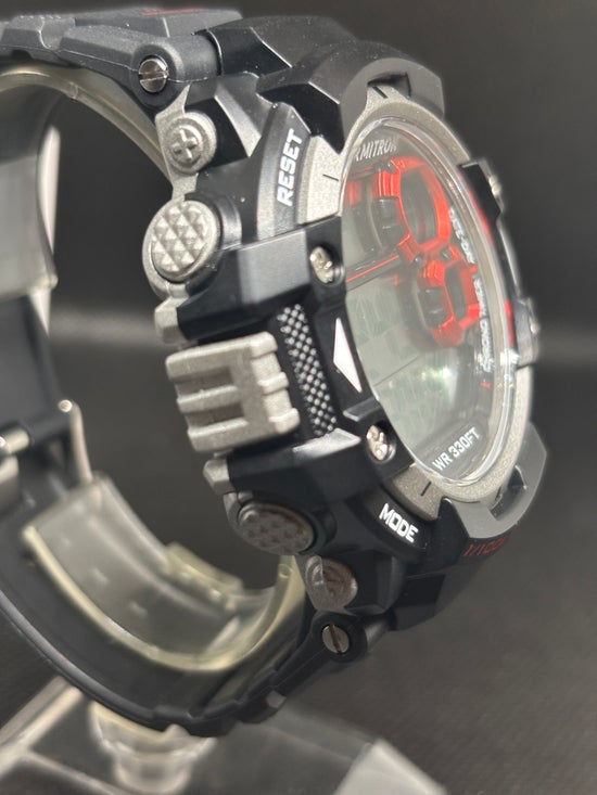- Sporty watch featuring day/date, chronograph, lap time, alarm, dual time, military time and backlight functions